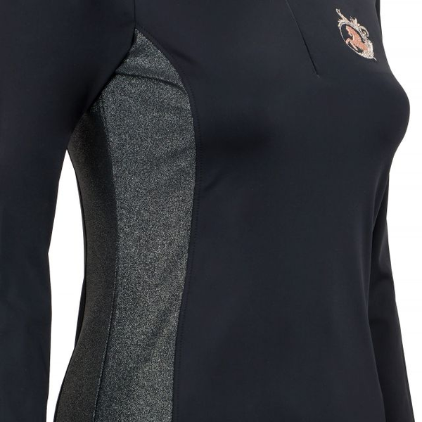 Trainingsshirt gemaakt van een innovatief materiaal dat zich perfect aanpast aan het lichaam en aangenaam aanvoelt. Bovendien is het ademend en sneldrogend. Versierd met glittermateriaal in de taille. Een kleine ritssluiting in de col.